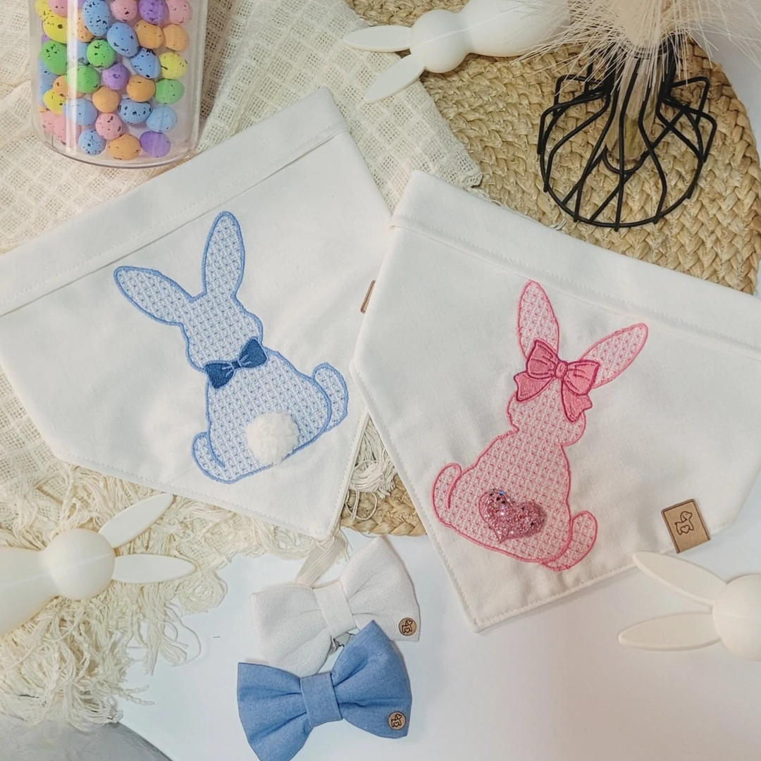 As bandanas de Páscoa integram uma coleção exclusiva e autoral, criada inteiramente dentro do nosso ateliê para celebrar a delicadeza da Páscoa com sensibilidade, charme e presença. Cada elemento foi pensado com intenção: dos bordados minuciosos às aplicações artesanais, dos coelhinhos com pompom aos rabinhos feitos à mão, tudo desenvolvido para transmitir ternura, encanto e um toque verdadeiramente único.